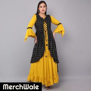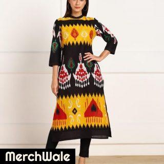 Zewran Ikkat Printed Straight Kurta For Women In Black & YellowRead More