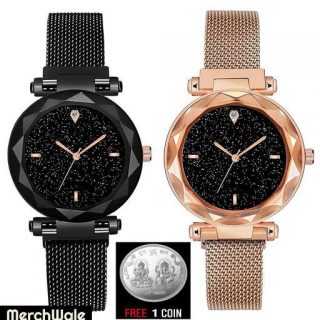 free silver coin with Black Round Diamond Dial with Latest Generation Black & Gold Magnet Belt Analogue Watch for Women Pack of - 2